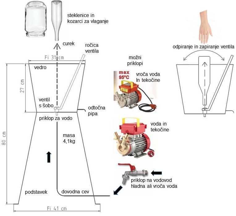 IZPIRALNIK I-100 čistilec steklenic naprava za čiščenje, izpiranje in sterilizacijo Izpiralnik I-100 je ročna naprava za čiščenje, izpiranje, sterilizacijo kot tudi žveplanje različnih steklenic in kozarcev za vlaganje ter druge steklene in plastične embalaže. Primerna je za steklenice z ozkim in širokim vratom ter kozarcev z vratom od premera Fi 15mm do Fi 100mm in več odvisno od načina dela, višina do 500mm in več, saj je curek vode-tekočine visok več kot 1 meter. Produktivnost cca 350 kom/h in več odvisno od usposobljenosti in stanja steklenic oziroma kozarcev. Sestoji se iz kovinskega pocinkanega vedra, ventila, krmilne ročice, odtočne pipe in podstavka iz nerjavnega jekla. Delovni postopek. Steklenico ali kozarec obrnjen navzdol z roko nastavimo na šobo in s krmilno ročico odpremo ventil za dotok vode ali druge tekočine. Ta pod pritiskom obrizga notranjost. Voda odteče v vedro in preko odtočne pipe na prosto ali v posodo za ponovno uporabo. Priklopi na vedru in odtočni pipi so G3/4 ter primerni za kovinske ali hitre priključke(Gardena). Izpiralno vedro se lahko priklopi na vodovod, ki ima običajno pritisk cca 4 bar ali na primerno črpalko, ki ima pritisk vsaj 2-3 bar. Napajanje je lahko s hladno in vročo vodo ali neko drugo tekočino. Ročaj na vedru omogoča enostavno prestavljanje na delovnem mestu.